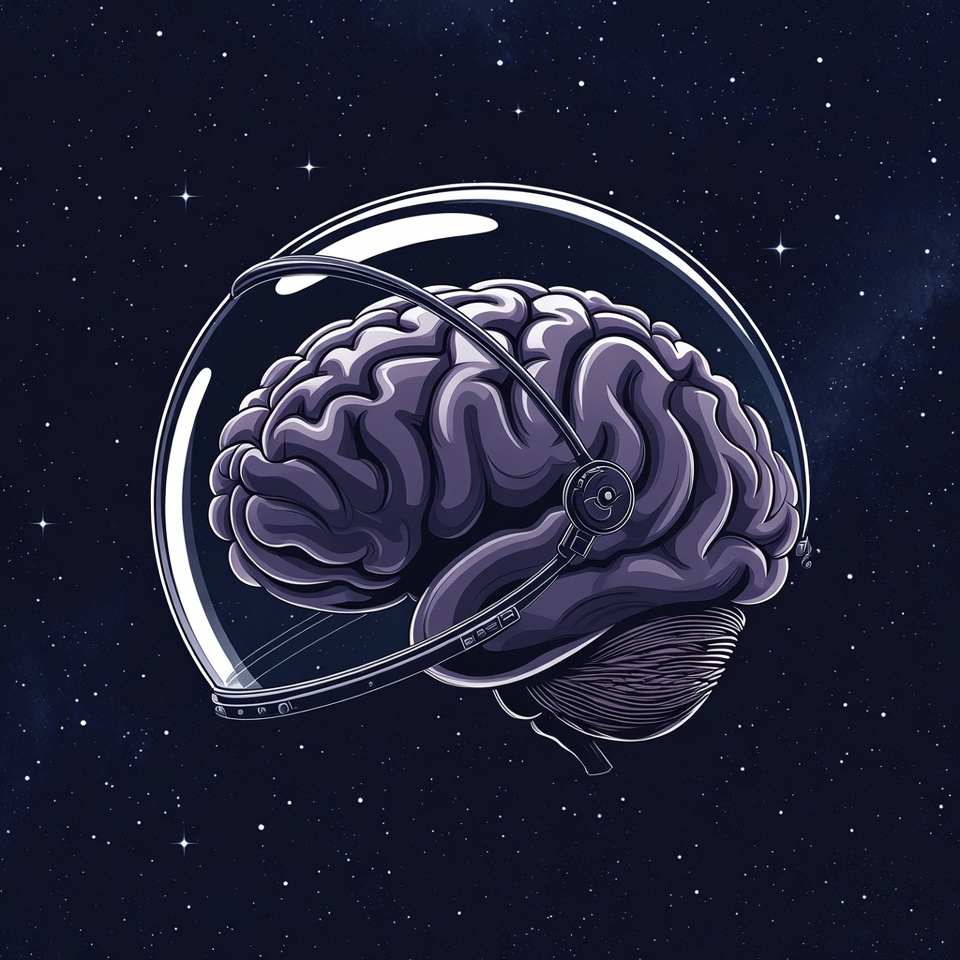 A detailed illustration of a purple human brain inside a transparent astronaut helmet. The helmet floats against a starry space background with twinkling stars. The design features glossy reflections on the helmet and a cosmic purple nebula.