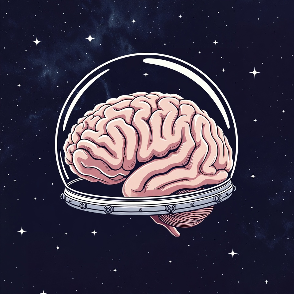 A pink brain encased in a clear astronaut helmet with a metallic rim floats against a starry space background. The brain features detailed wrinkles and a visible tail-like cerebellum. Subtle stars and cosmic elements surround the isolated illustration.