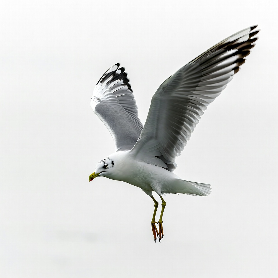 A seagull with white feathers and black wing tips flies with wings fully extended. It has a yellow beak and legs, and yellow eyes with black markings. The bird is isolated against a plain white background.