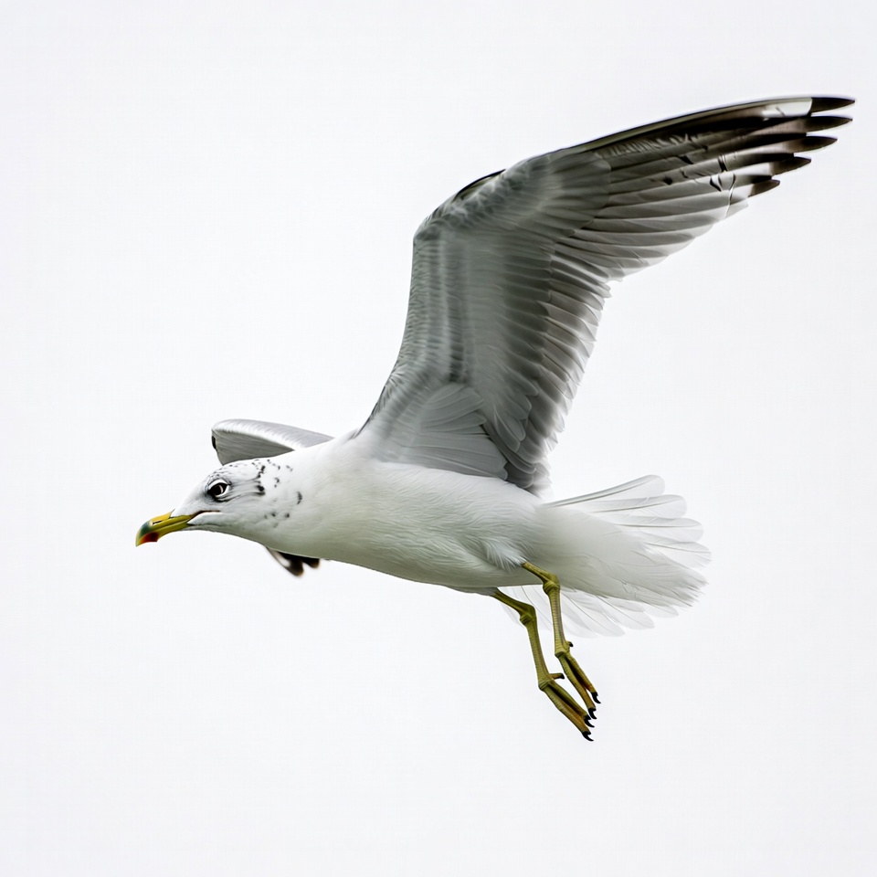 avian, bird, black wingtips, flying, gray feathers, isolated, seabird, white background, wildlife, wings spread, yellow beak, yellow legs, seagull