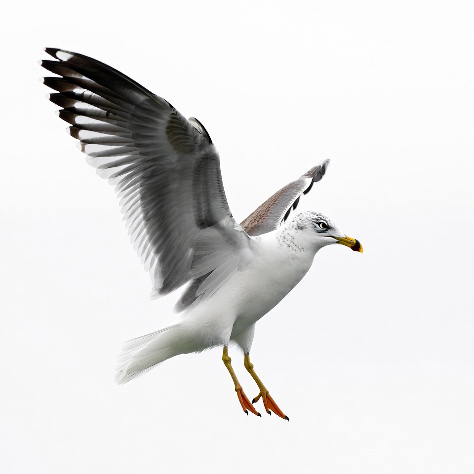 A seagull flies with its wings fully extended against a plain white background. The bird features white feathers, gray wing tips, a yellow beak, and orange legs and feet. Its head is turned slightly to the side.
