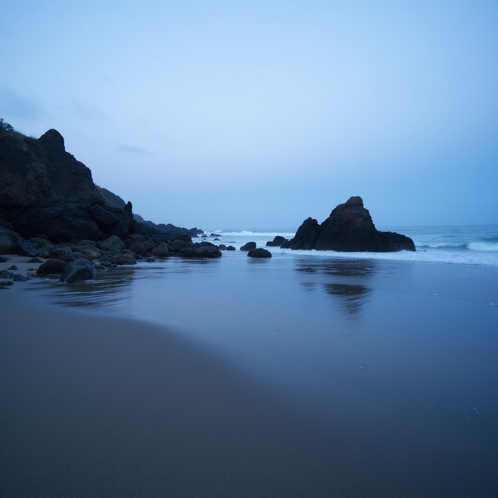 A serene beach scene at twilight features calm waves lapping against a sandy shore lined with scattered rocks. Dark rocky cliffs rise on the left under a blue hazy sky. Smooth reflections of the rocks and water create a tranquil foreground.