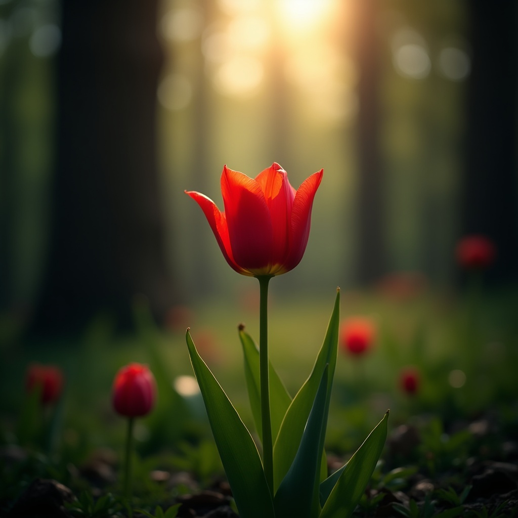 Red Tulip in Sunlit Forest