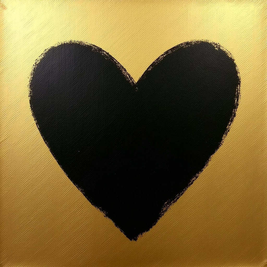 A large black heart shape is painted with rough brushstrokes on a shiny gold background. The heart is centered and prominent against the metallic surface. The image features a minimalist abstract design.