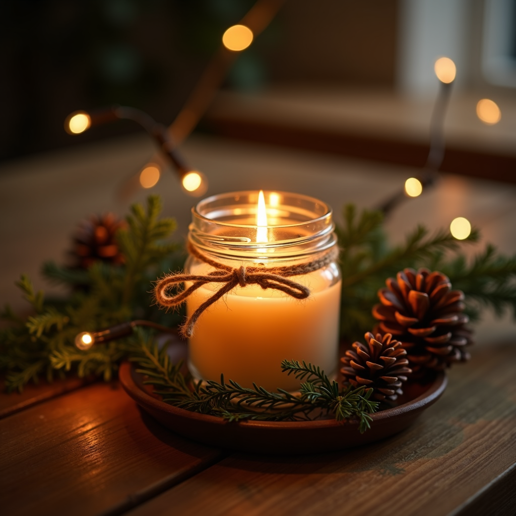 A lit candle in a clear mason jar with a twine bow sits on a wooden plate surrounded by pine branches and pine cones. Fairy lights twinkle in the blurred background near a window. The warm candlelight illuminates the cozy holiday arrangement on a rustic wooden table.