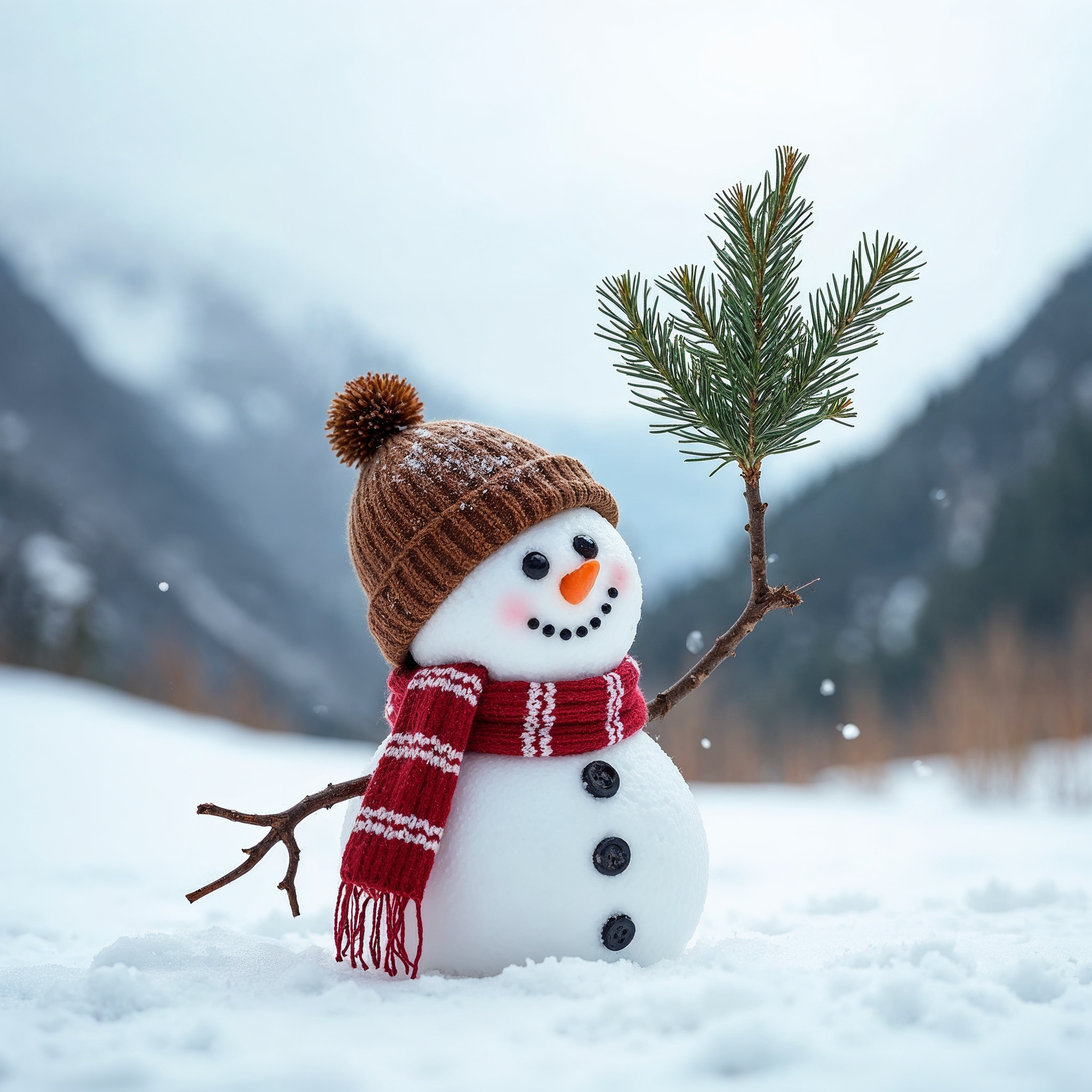 A cheerful snowman with a brown knit hat, red plaid scarf, and stick arms stands in snowy mountains. It holds a green fir branch in one twig hand and smiles with black coal eyes and buttons. Snowflakes fall around it on a white snowy ground with distant peaks.