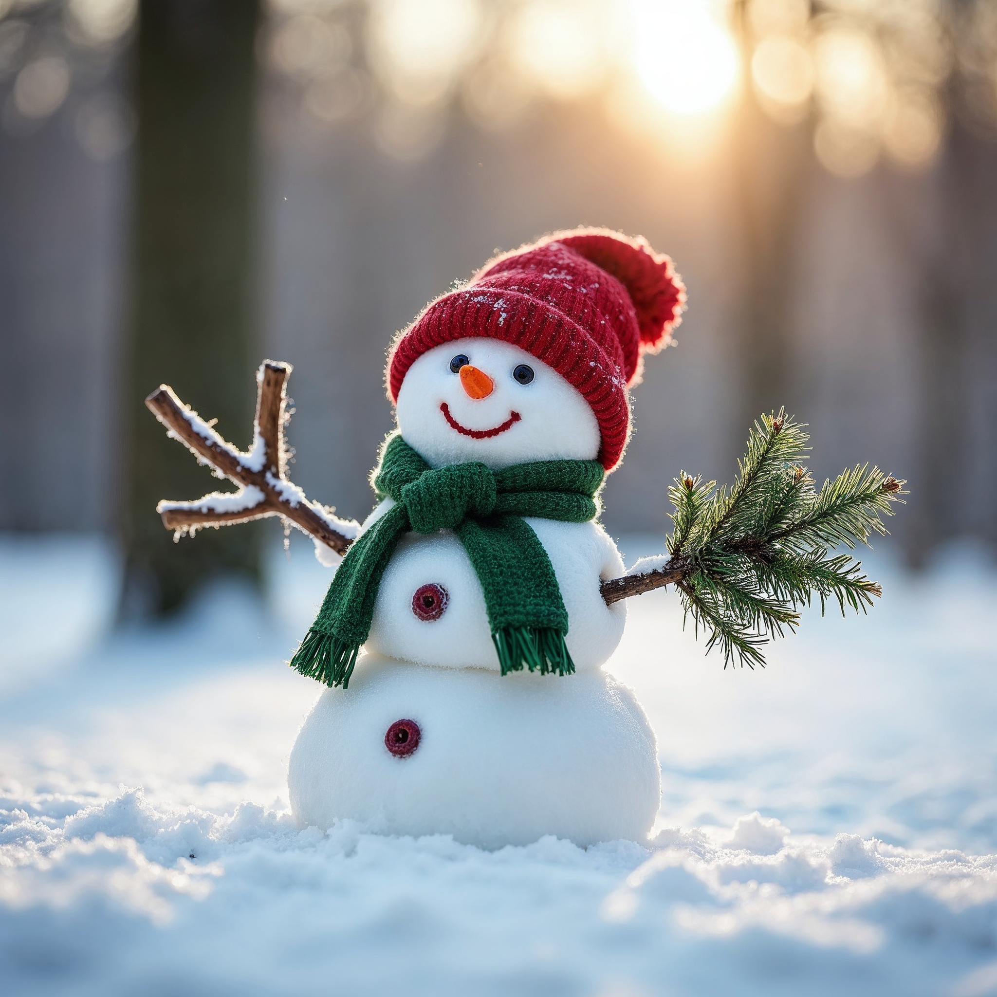A cheerful snowman stands in a snowy forest with trees in the background and sunlight filtering through. It wears a red knit hat with a pom-pom and a green scarf. The snowman holds a small pine branch in one twig arm and has a smiling face with coal eyes.