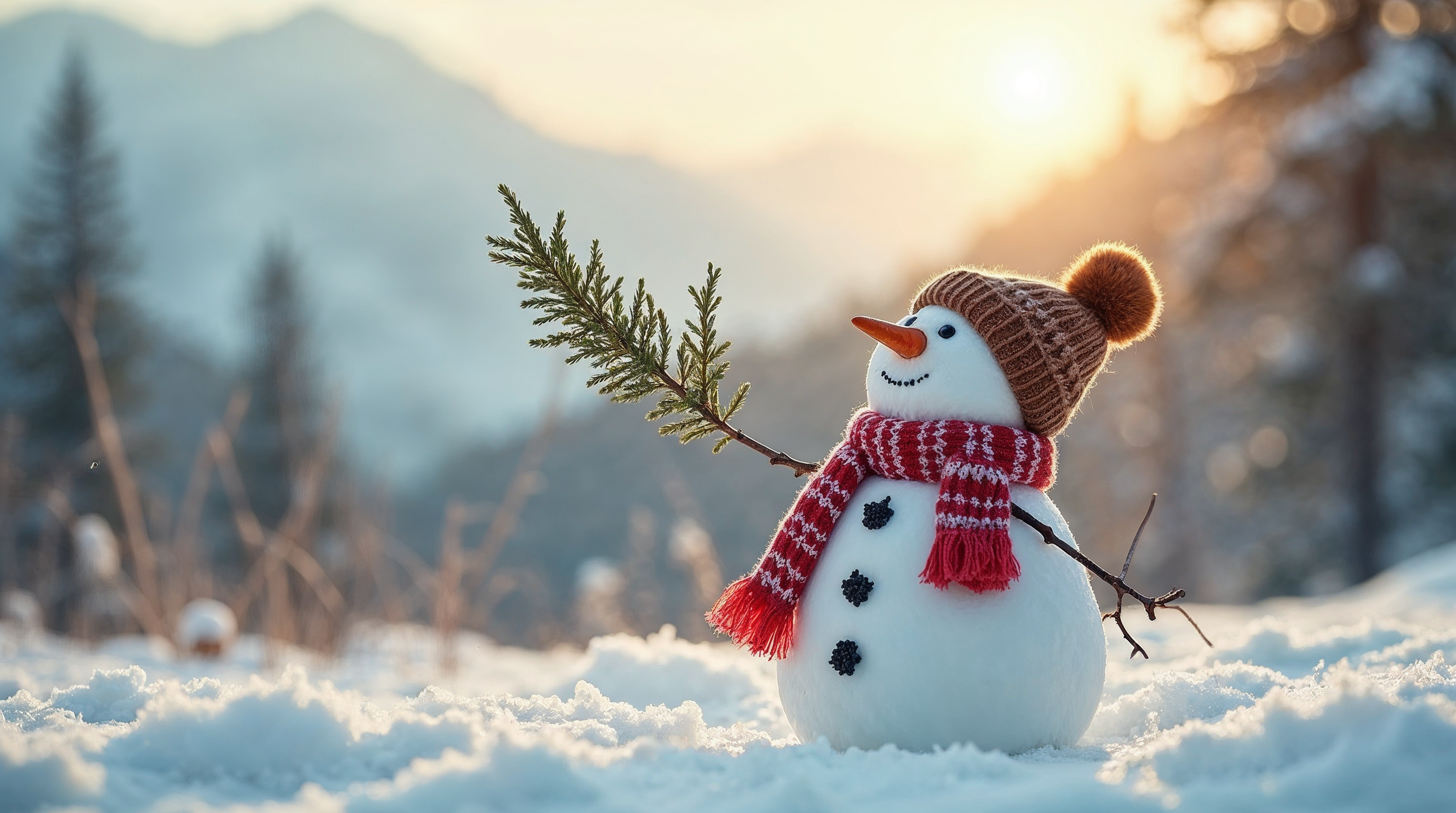 A cheerful snowman wearing a red striped scarf and brown knit hat with pom-pom stands in deep snow. It holds a green fir branch in one twig arm and smiles with coal eyes and carrot nose. Snowy mountains, pine trees, and a golden sunset glow in the background.