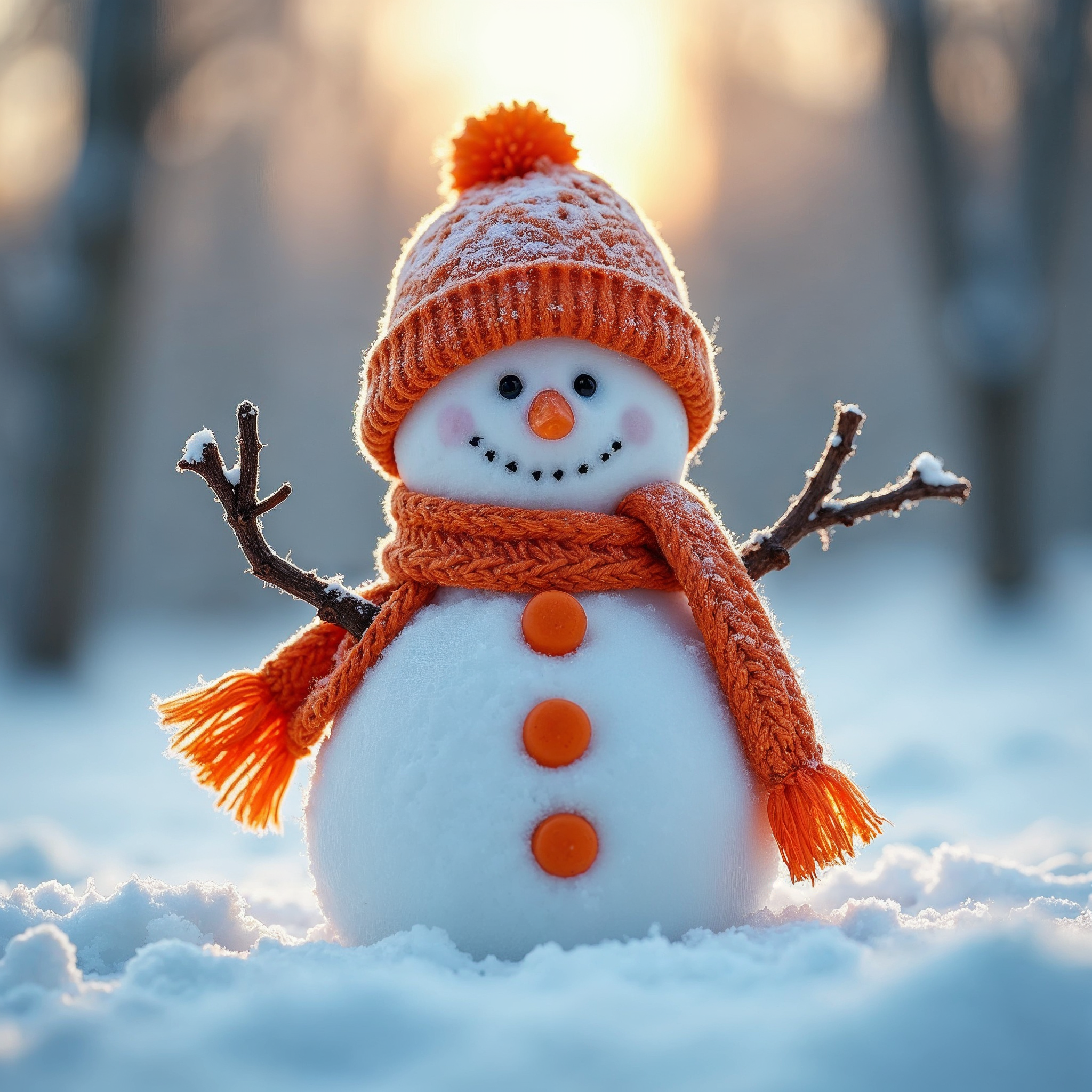 A cheerful snowman stands in snowy woods at sunset. It wears a knitted orange hat with a pom-pom, matching scarf, and has a smiling face with black eyes and three orange buttons. Bare branches form its arms, covered lightly in snow.