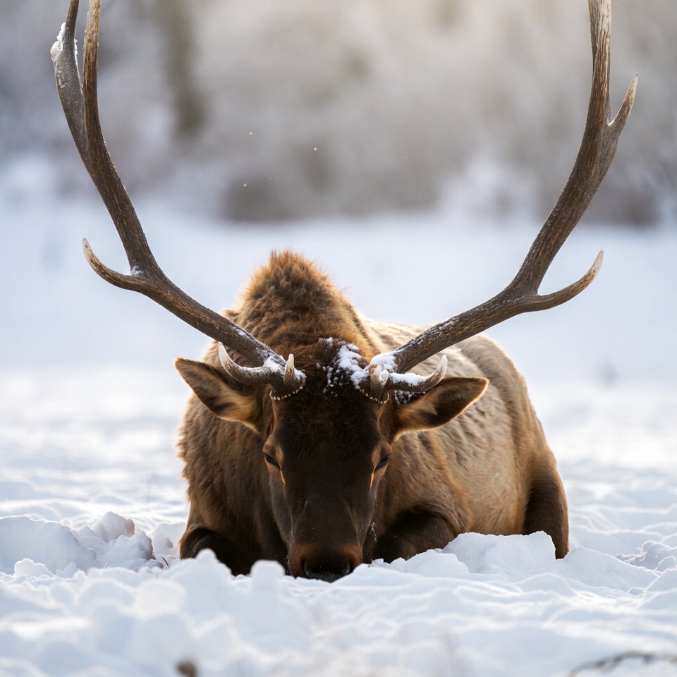 A large elk with massive antlers lies on the snow-covered ground in a winter forest. Snow dusts its reddish-brown fur and antlers, with blurred snowy trees in the background. The elk faces forward with its head lowered toward the snow.