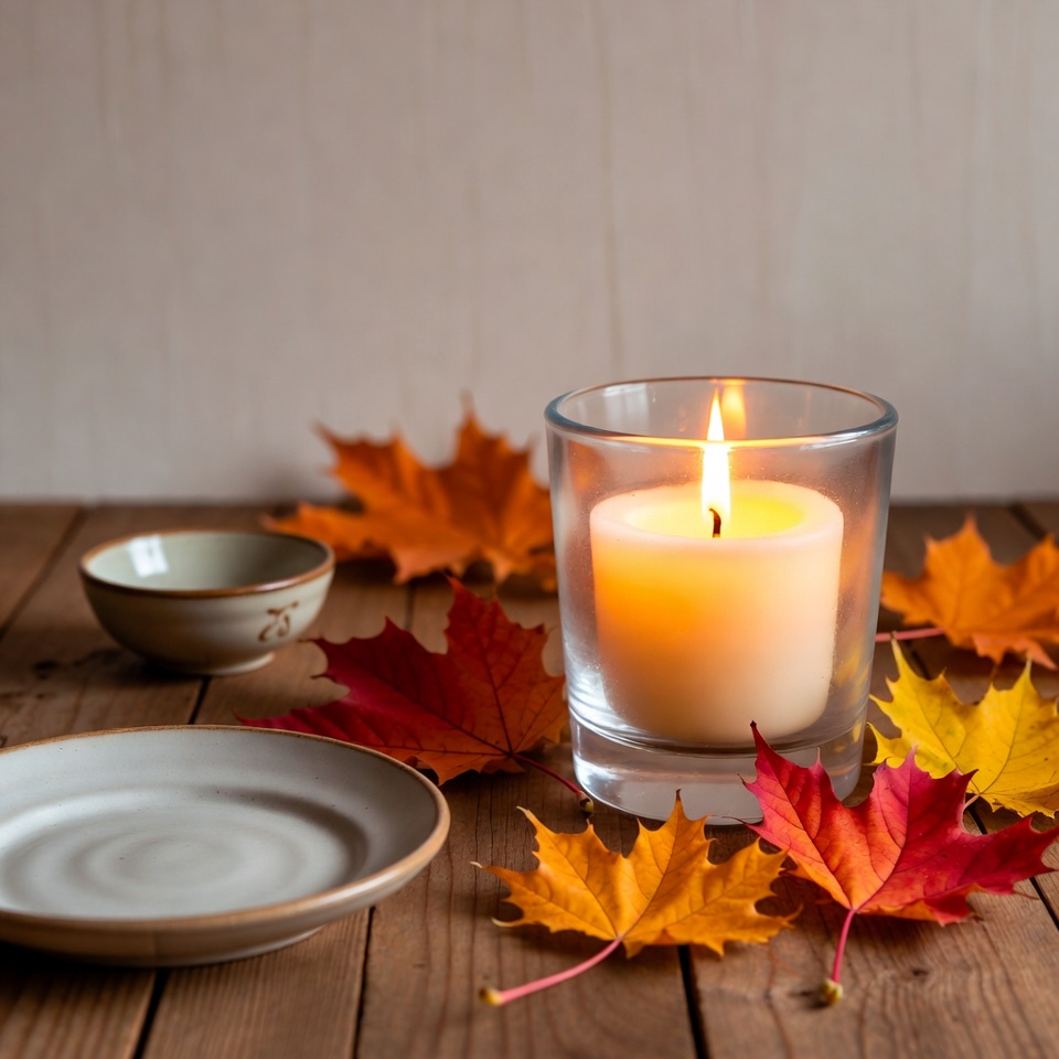 A glowing candle in a clear glass holder sits on a wooden table surrounded by vibrant red and orange autumn leaves. A small ceramic bowl and a white plate are placed nearby among the scattered leaves. The soft flame illuminates the cozy fall scene against a light background.