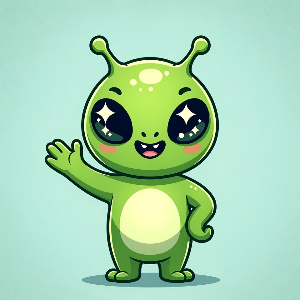 A kawaii-style cartoon green alien with large sparkling eyes and antennae stands on a light blue background. It has a smiling mouth, white belly, and is happily waving one hand while posing with the other. The illustration features glossy highlights and a friendly, childlike design.