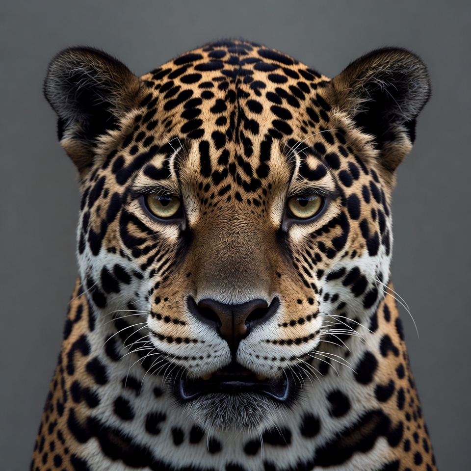 animal face, big cat, close-up, detailed fur, ears, feline, golden fur, gray background, green eyes, head shot, intense gaze, leopard spots, muzzle, portrait, predator, realistic, rosettes, spotted cat, whiskers, wild animal, wildlife, jaguar