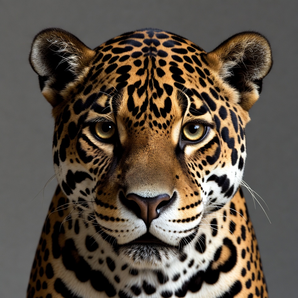 A majestic jaguar stares directly at the camera with intense yellow eyes. Its head features distinctive black rosettes on golden fur, with prominent whiskers and rounded ears. The animal is centered against a plain gray background.