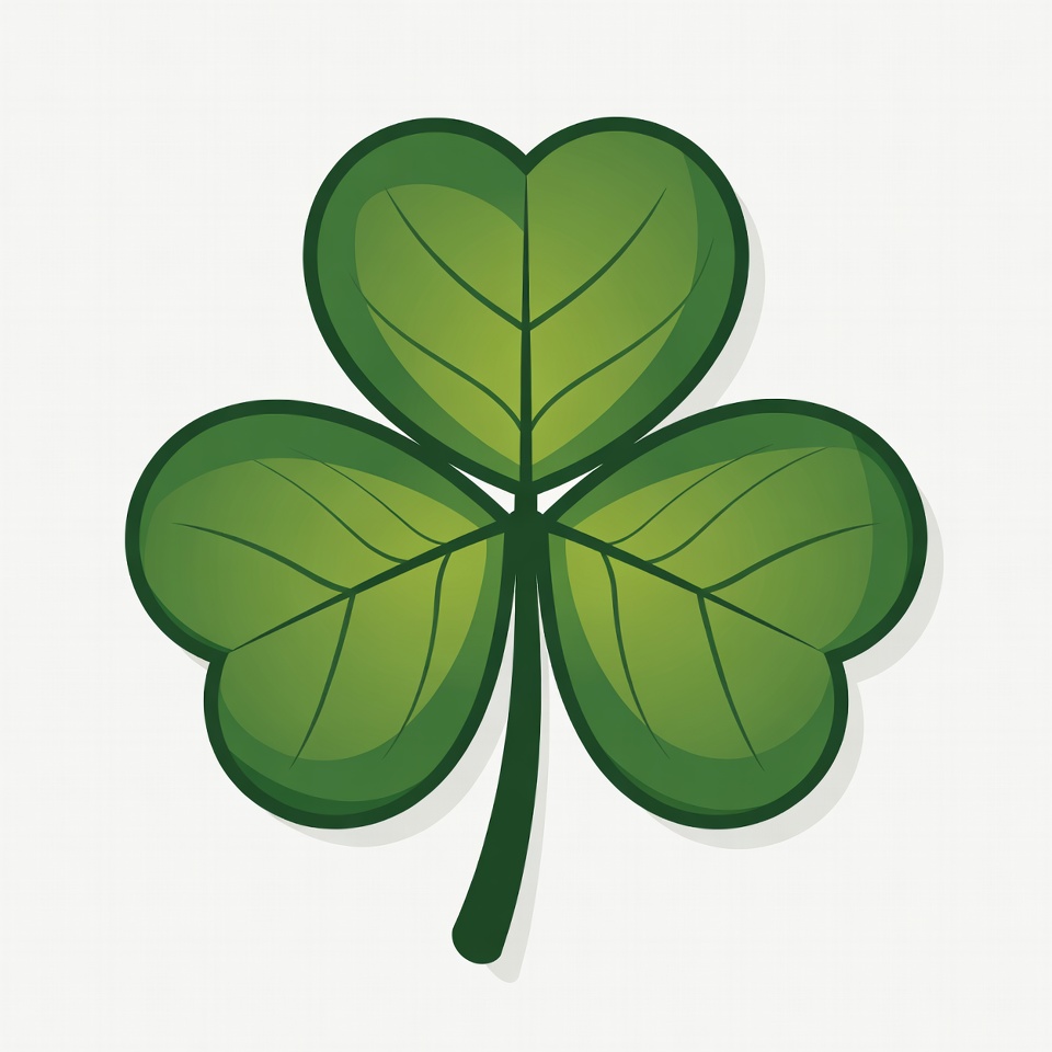 A vibrant green four-leaf clover illustration features rounded leaves with visible veins on a white background. The stem is centered at the bottom. It has a smooth, cartoonish vector style.