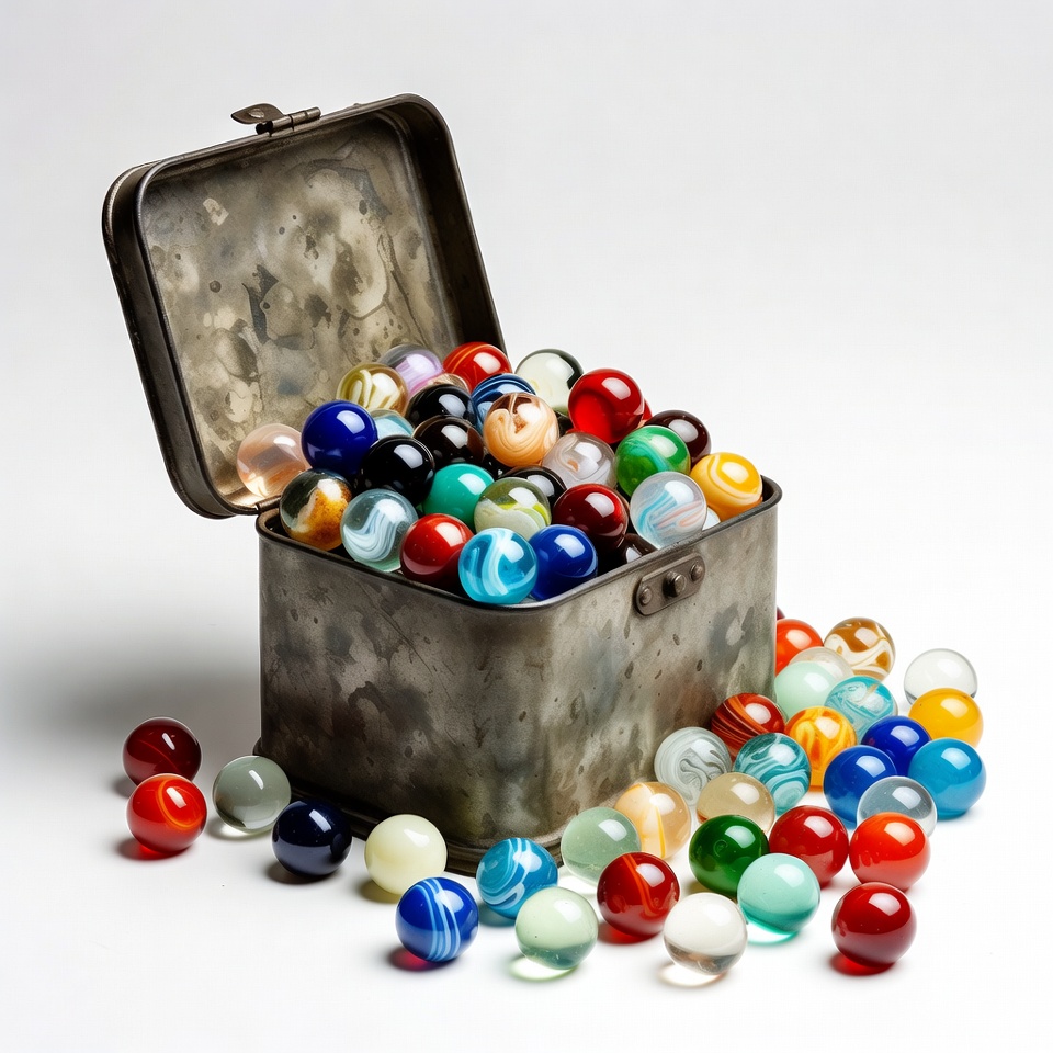 blue marbles, colorful marbles, glass marbles, green marbles, marble collection, marbles spilling, metal tin, open box, overflowing marbles, red marbles, swirled marbles, tin box, toy marbles, vintage tin, white background, yellow marbles, marbles
