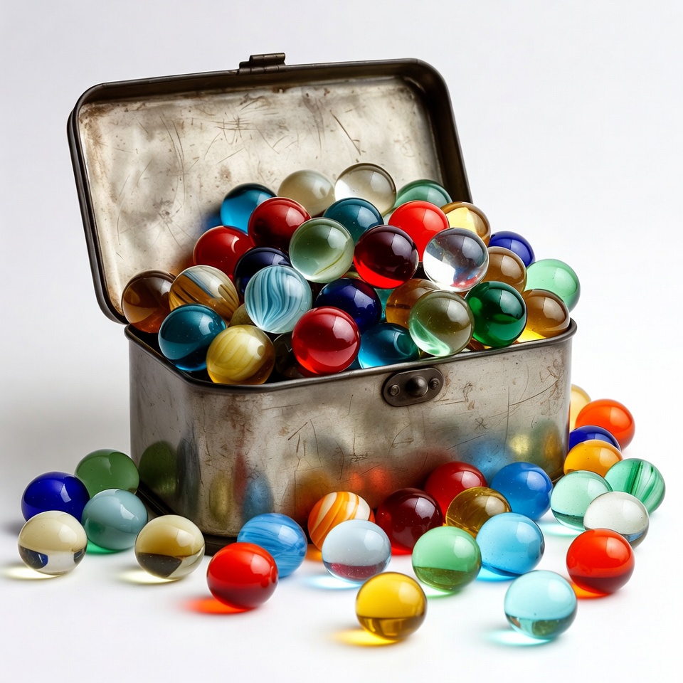 An open, weathered tin box overflows with a vibrant collection of multicolored glass marbles. The marbles spill out onto a white surface, displaying shades of red, blue, green, yellow, and more. Light reflects off their glossy surfaces, creating colorful highlights.