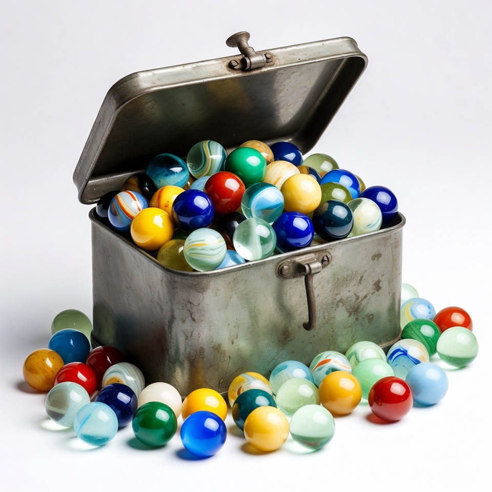 antique box, blue marbles, clear marbles, colorful marbles, game marbles, glass marbles, green marbles, kids toys, marble collection, marbles spilling, metal tin, open box, red marbles, shiny marbles, swirling patterns, toy marbles, vintage tin, white background, yellow marbles, marbles