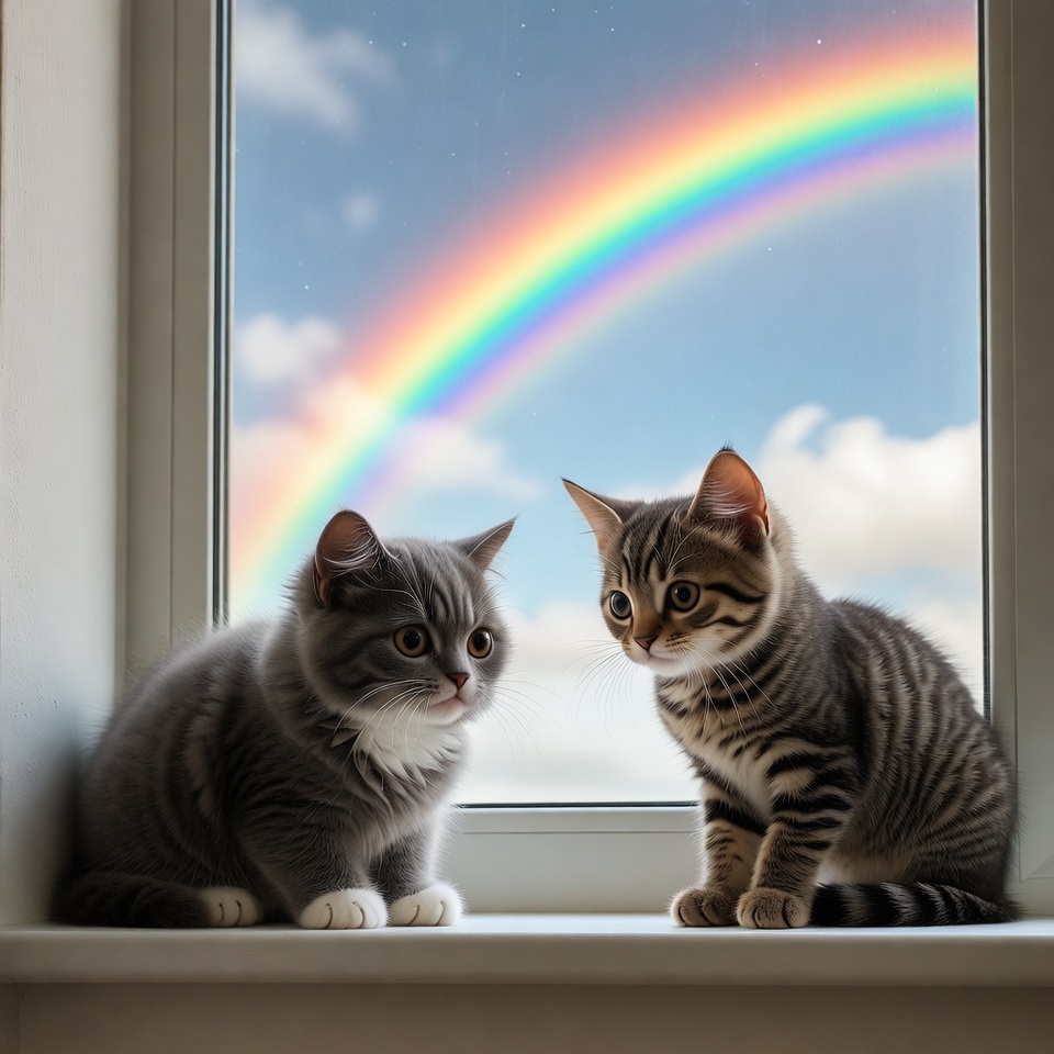 Two adorable gray kittens sit on a windowsill gazing at a vibrant rainbow in the blue sky outside. One kitten has solid gray fur with white paws, while the other features tabby stripes. The window frames a dreamy scene with stars and clouds.