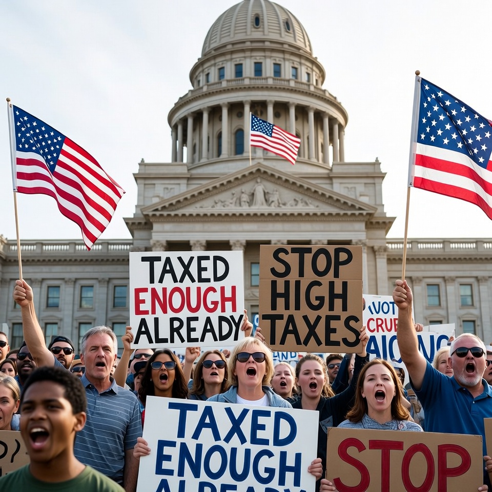 A large crowd of diverse protesters holds signs reading 'Taxed Enough Already' and 'Stop High Taxes' in front of a domed capitol building. They wave American flags and chant during the demonstration. The group includes men and women of various ages and ethnicities, dressed in casual summer clothing.