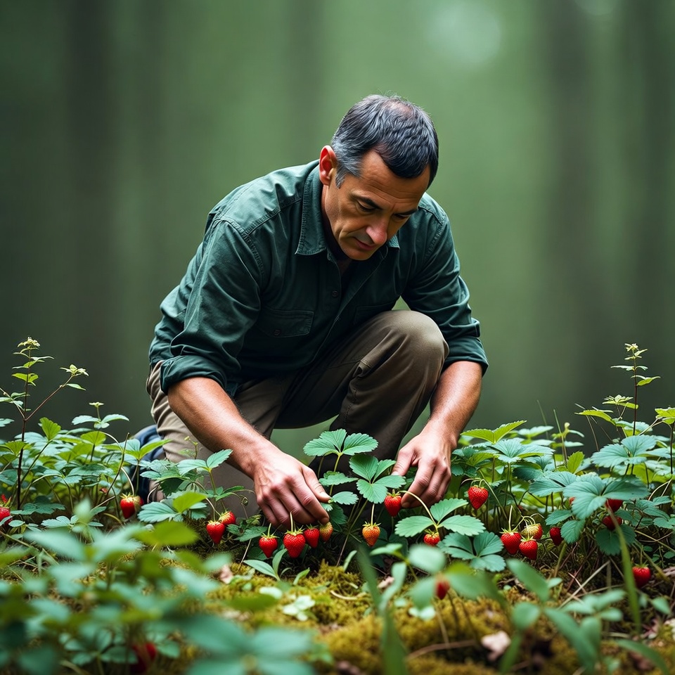 A middle-aged man with short graying hair kneels in a lush green forest, picking ripe red strawberries from plants. He wears a green shirt and khaki pants, focused on the berries surrounded by green leaves and mossy ground. The background features a blurred forest with green foliage.