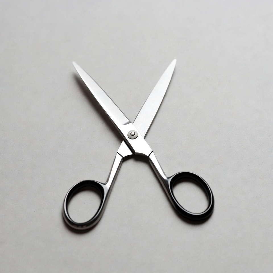 A pair of silver scissors with black handles lies open on a plain white background. The blades are sharp and shiny, crossed at the pivot point. The handles feature ergonomic black grips.
