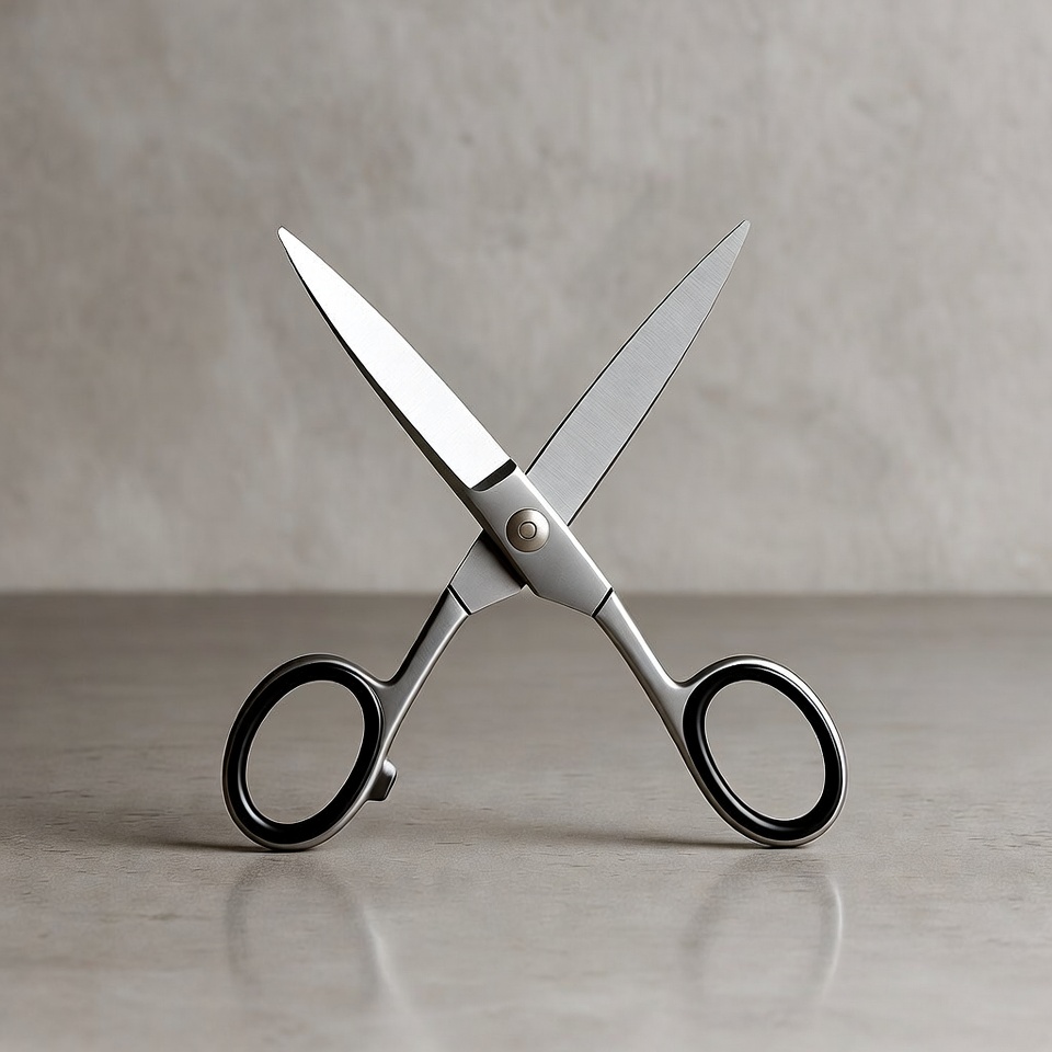 A pair of silver scissors with black handles lies open on a smooth gray surface. The blades are crossed and sharply pointed, reflecting light subtly. The isolated background emphasizes the clean, metallic design.