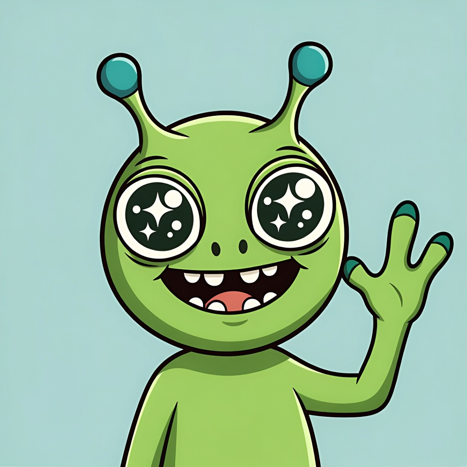 A cute green alien character with large sparkling eyes and antennae waves happily on a light blue background. The illustration features a wide smiling mouth with teeth, green skin, and five-fingered hands. It is a vibrant cartoon style with starry eye highlights.