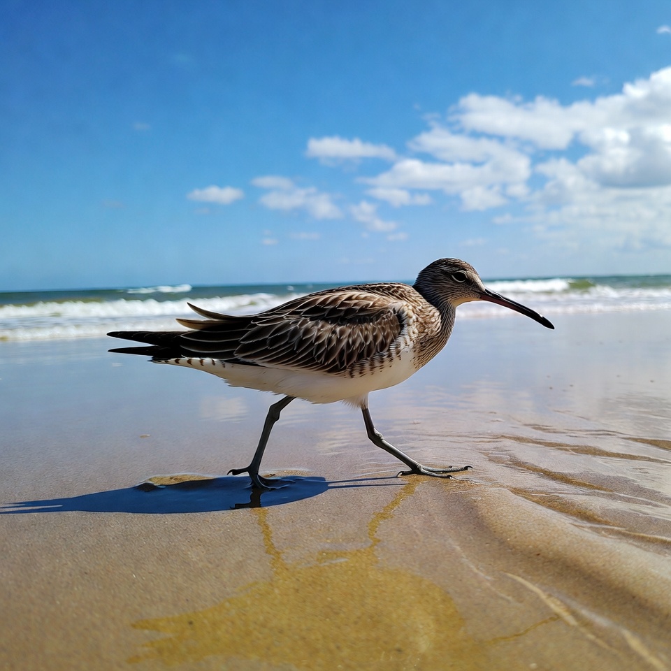 A whimbrel with brown and white plumage and a long curved bill walks along a sandy beach. Gentle waves lap at the shore under a bright blue sky with scattered clouds. Its shadow is cast on the wet sand.