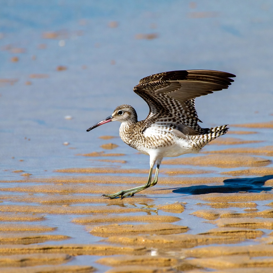 A ruff sandpiper with spotted brown and white feathers spreads its wings while standing on a sandy beach. Its long thin bill points forward, and green legs are visible beneath its body. Shallow water and wet sand surround it under a clear blue sky.