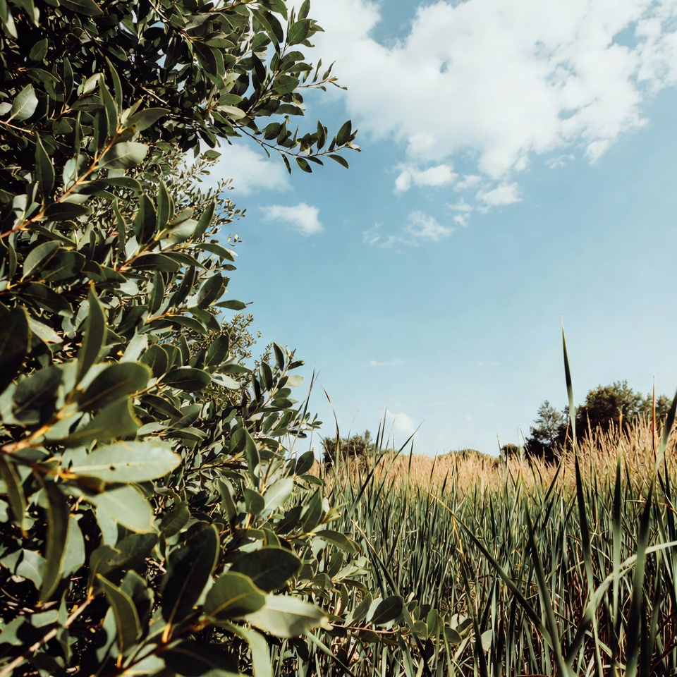blue sky, bushes, cloudy sky, daylight, field, foliage, green leaves, greenery, landscape, natural, nature, outdoor, plants, reeds, sky, stems, tall grass, vegetation, white clouds, green bushes