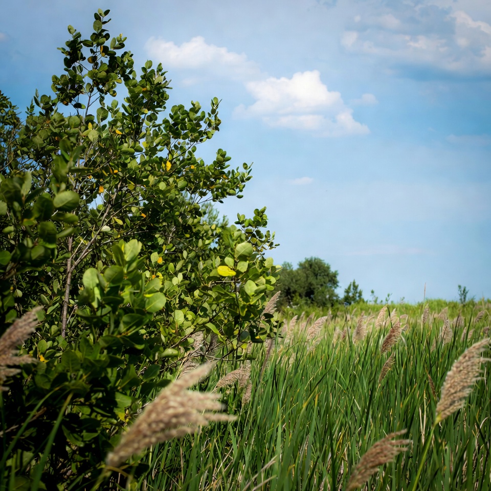 blue sky, bushes, field, glossy leaves, grass field, greenery, landscape, meadow, natural scenery, nature, outdoors, pampas grass, plants, summer landscape, tall grass, vegetation, white clouds, green bushes