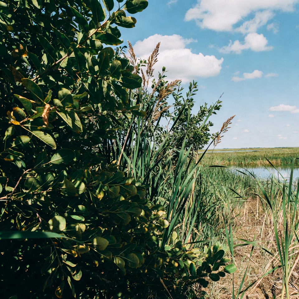 aquatic plants, blue sky, bushes, daylight, grass, green bushes, green reeds, lake, landscape, lush vegetation, marsh, natural, nature, outdoor, phragmites, plants, pond, scenery, summer, swamp, water, wetland, white clouds, reeds