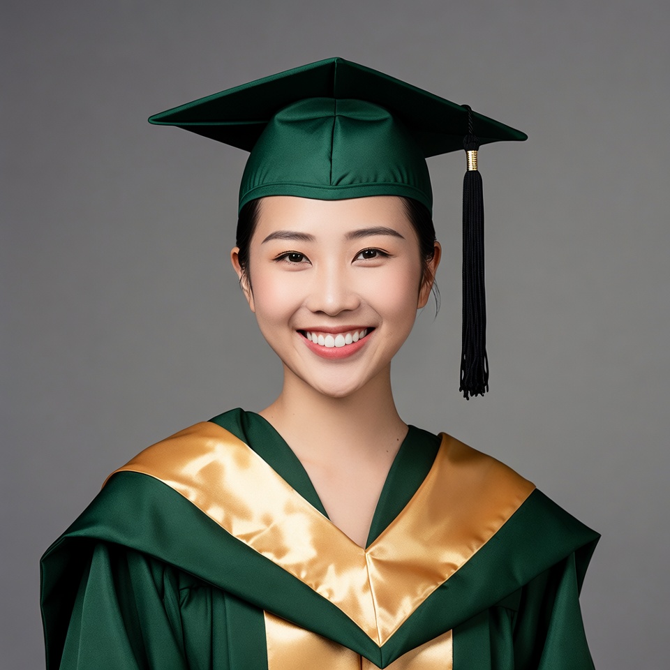 A young Asian woman with straight black hair smiles at the camera while wearing a green graduation cap and gown with gold trim. She stands against a plain gray background, posing confidently for a portrait. The tassel on her mortarboard hangs to the side.