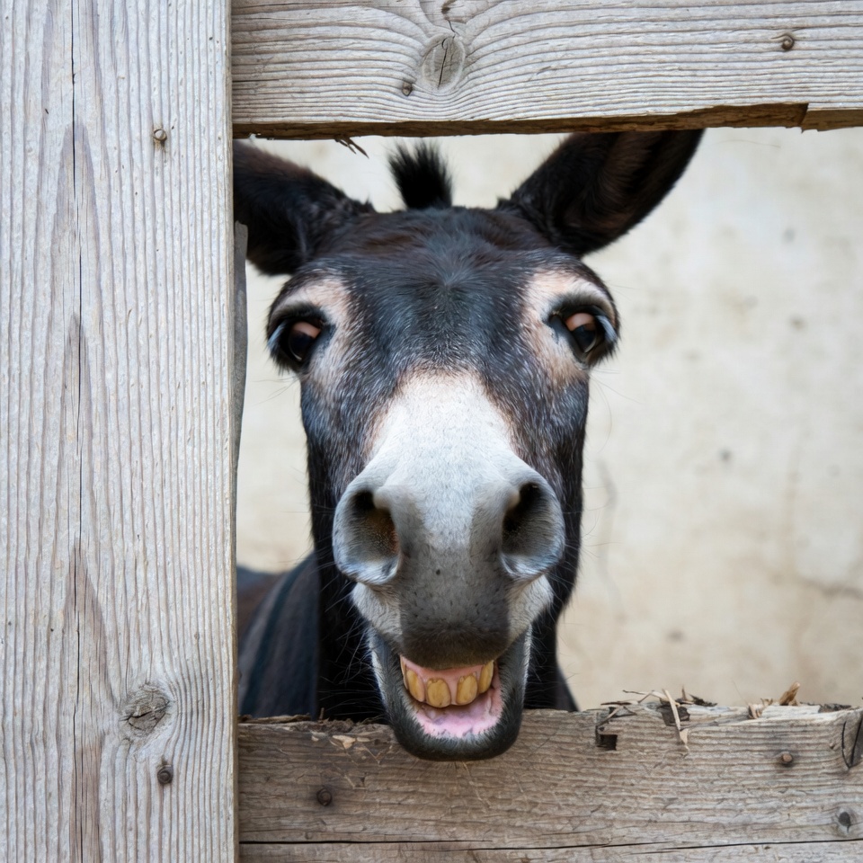 A black donkey with white muzzle peeks its head through a wooden fence slats. Its large ears stick out above the fence, and it has expressive eyes and an open mouth showing teeth. The background is a light-colored wall.