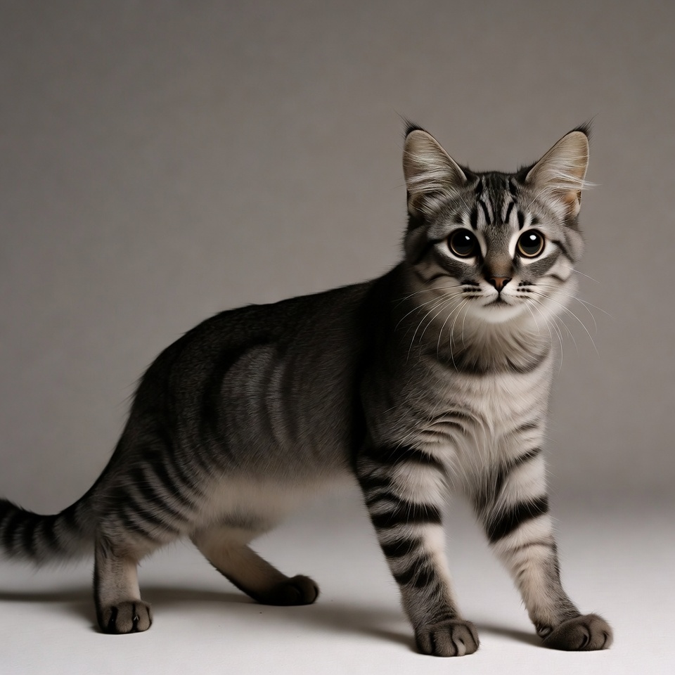 A young gray tabby kitten stands on a light gray background. It has striking striped fur, large green eyes, and pointed ears. The kitten is captured in a side profile pose with its tail slightly raised.