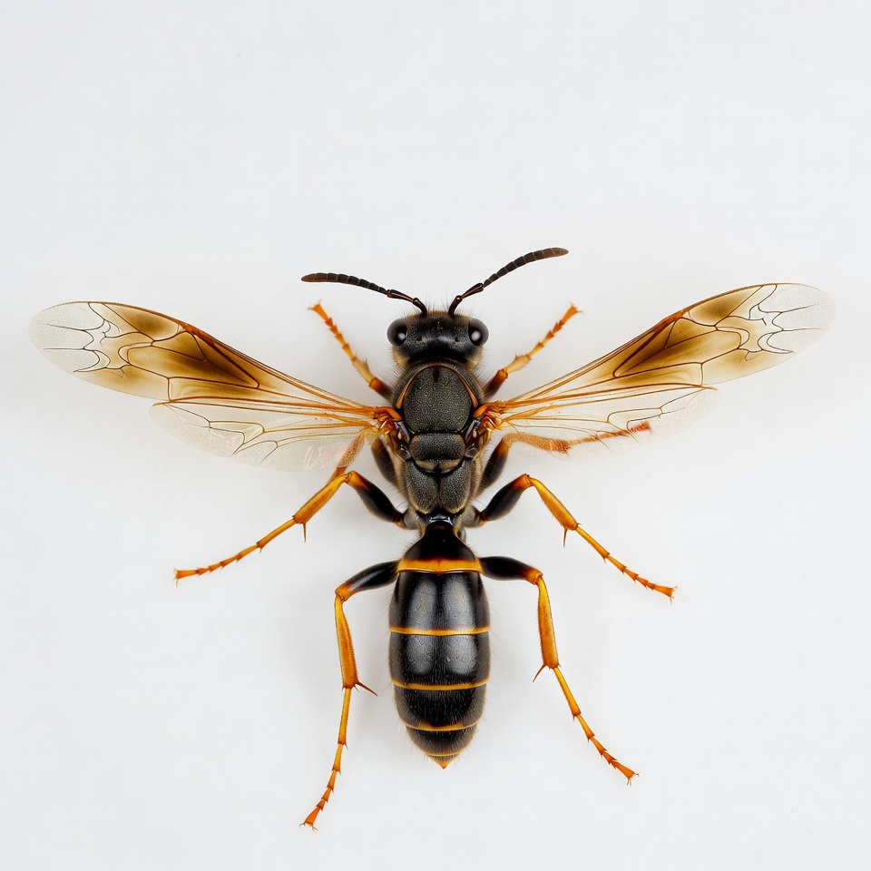 A potter wasp with a black and orange striped abdomen is positioned on a white background. Its wings are spread open, revealing translucent brown hues. The insect features long orange legs and prominent antennae.