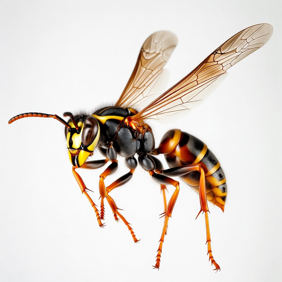 A detailed yellow jacket wasp with black and yellow striped body is captured in mid-flight. Its translucent wings are spread wide, and orange legs are extended. The insect is isolated against a white background.