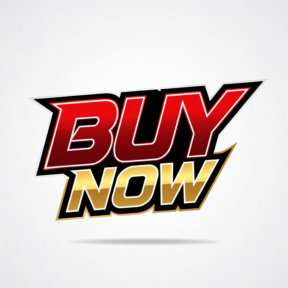 A vibrant graphic design features the bold text 'BUY NOW' in red and gold colors with black outlines and dynamic speed lines. The text is rendered in a modern, energetic font on a transparent white background. It has a slight shadow effect for added depth.