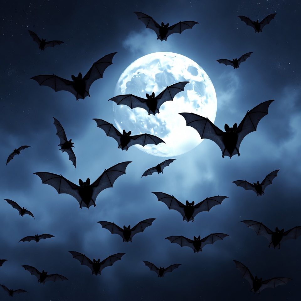 Numerous black bats fly across a dark night sky surrounding a large glowing full moon. The scene features a cloudy background with silhouettes of bats in various flying poses. The bright moon illuminates the bats against the deep blue and black hues.