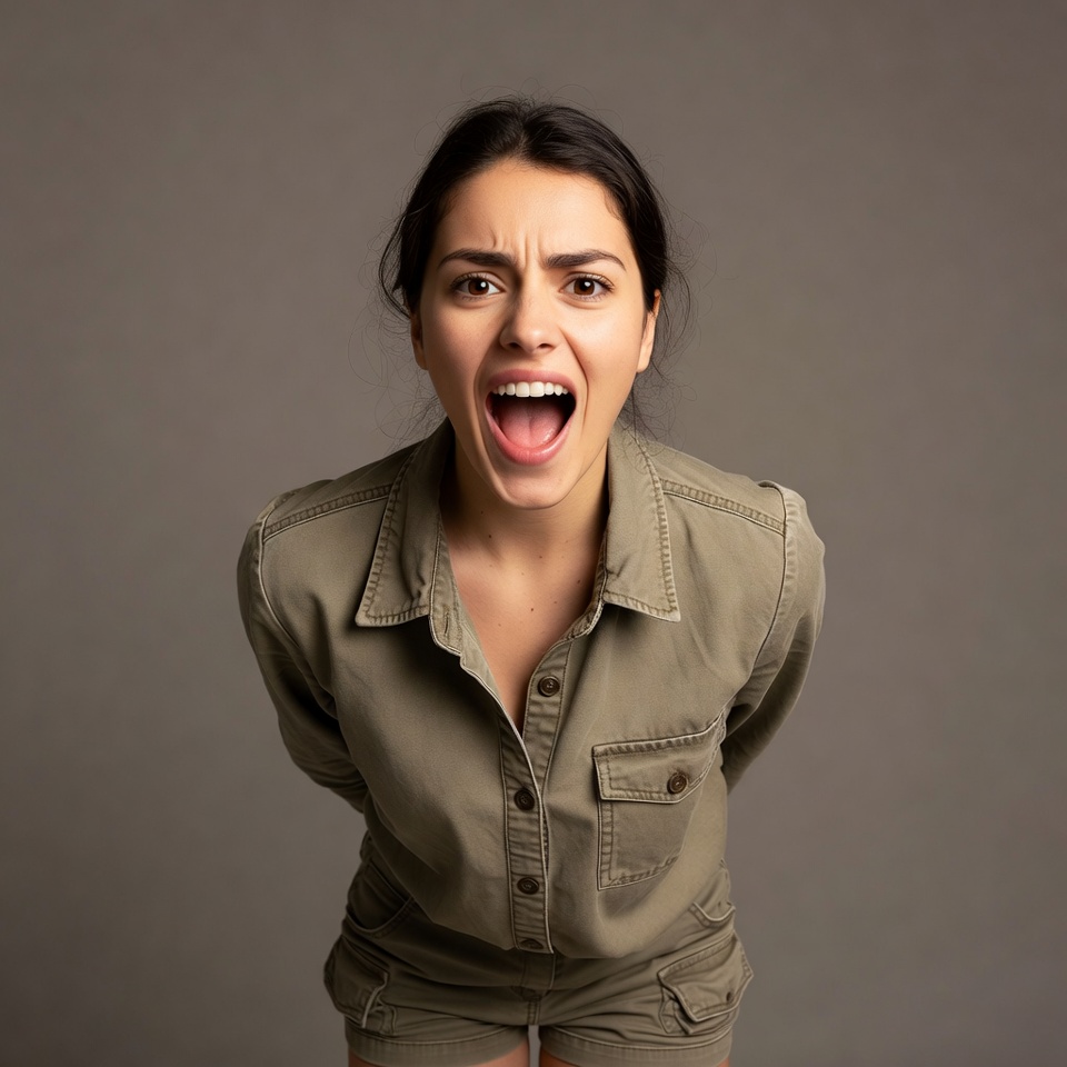 A young woman with dark hair pulled back stands against a gray background, screaming with her mouth wide open and eyebrows furrowed. She wears a khaki green jumpsuit with long sleeves, buttons down the front, and shorts, posed with arms behind her back. Her expression conveys intense emotion.