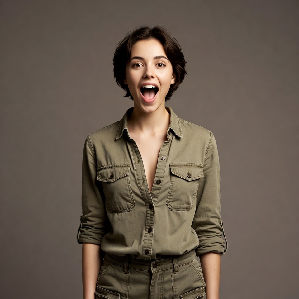 A young woman with short dark brown hair stands against a plain gray background. She wears an open khaki green shirt and matching pants, smiling with her mouth wide open and eyes bright. Her expression is joyful and direct to the camera.