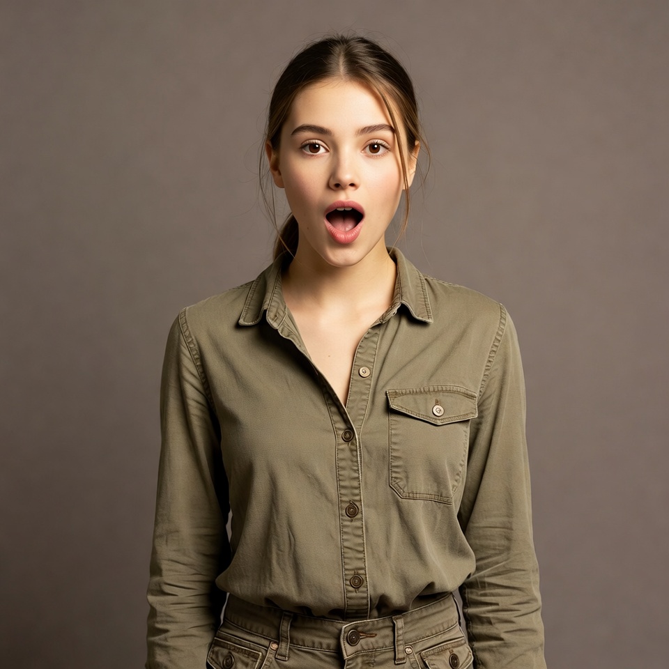 A young woman with light brown hair in a ponytail stands against a gray background. She wears a green button-up shirt with rolled sleeves and has a surprised expression with her mouth wide open. Her eyes are wide and she looks directly at the camera.