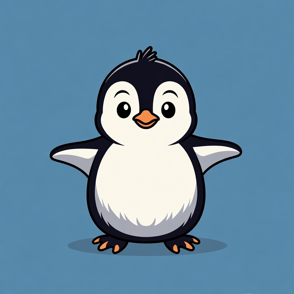 A cute cartoon penguin with black head and white belly stands on a blue isolated background. It has large expressive eyes, orange beak and feet, and spreads its flippers wide. The illustration features bold outlines and a chubby, adorable design.