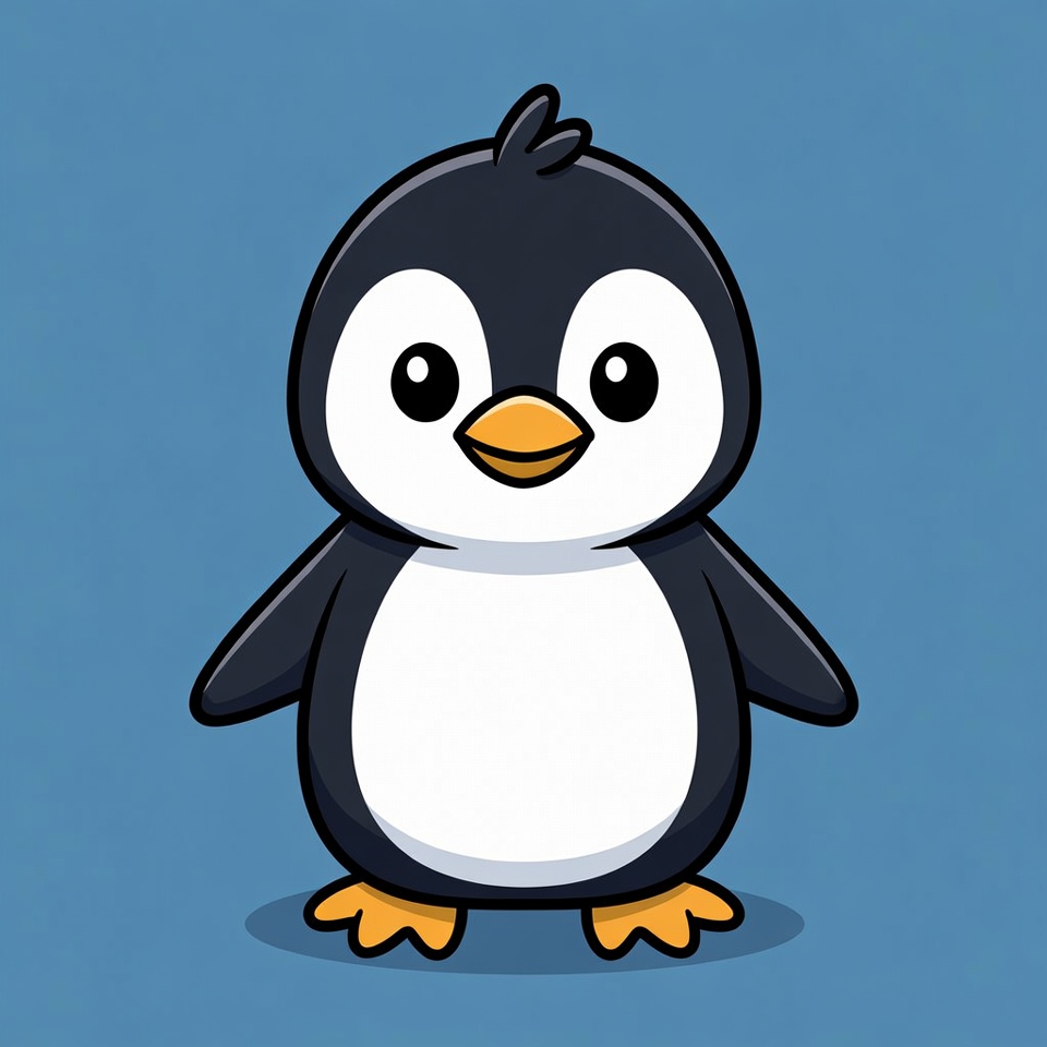 A cute cartoon penguin stands on a blue isolated background. It has black feathers, a white belly, large expressive eyes, and orange beak and feet. The chibi-style illustration features a tuft of hair on its head.