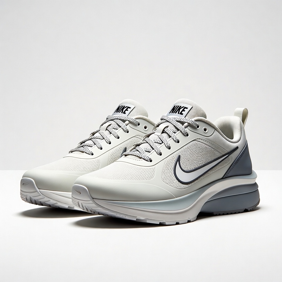 Nike logo, athletic footwear, casual sneakers, footwear, grey accents, gym shoes, isolated background, lace-up shoes, mesh panels, running shoes, sneakers pair, sport shoes, training shoes, white sneakers, Nike shoes