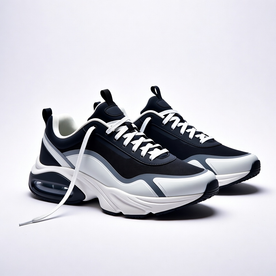 air cushion, athletic shoes, black sneakers, chunky sneakers, fashion footwear, isolated background, lace-up shoes, navy blue, running shoes, shoes pair, sport shoes, trendy sneakers, white accents, white sneakers, sneakers