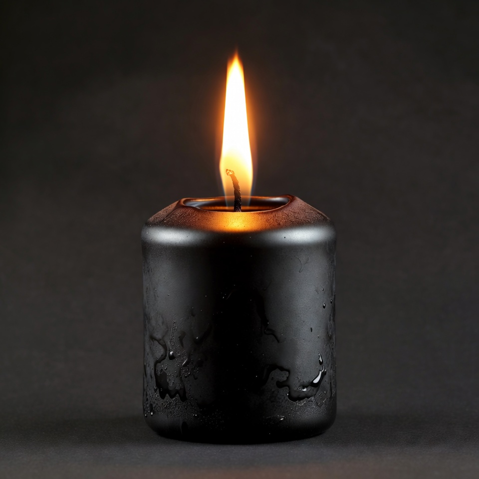black candle, burning candle, candlelight, dark background, fire, flame, glossy candle, isolated, lit candle, votive candle, wax, wick, yellow flame, candle