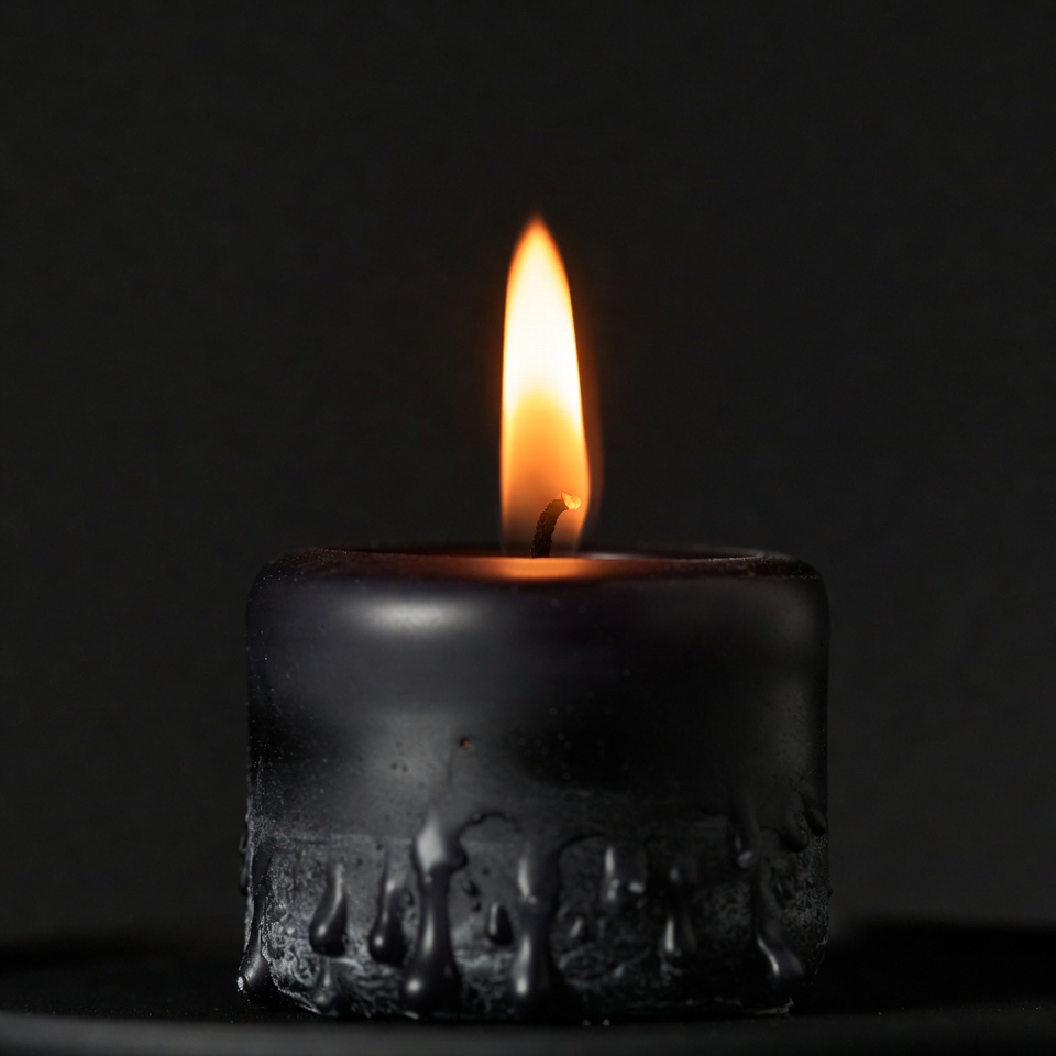 A small black candle with dripping wax burns brightly on a black surface. The flame glows orange against the dark background. Melted wax trails down the sides of the candle.