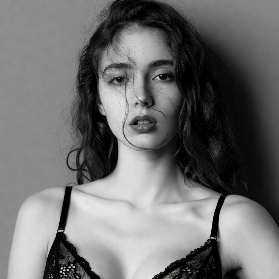 A young woman with long wavy dark hair poses against a gray background in a black and white photograph. She wears a lace bra with thin straps and has a subtle expression with slightly parted lips. Her hair falls over her shoulders, framing her face.